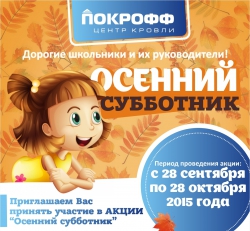 Подведение итогов акции намечено на 30 октября. Напомним, компания "Покрофф" подготовила ценные призы для всех участников "Осеннего субботника": каждый школьник, который войдет в трудовой отряд, получит денежную премию. На память останутся сладкие подарки, кепки и футболки, дипломы каждому участнику акции, а также масса положительных эмоций. Команда-победитель, которую выберут по результатам голосования жюри, отправится в развлекательный центр.
