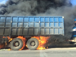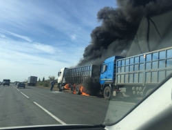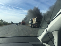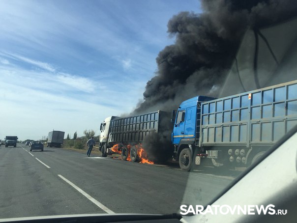 В соцсетях начали появляться фотографии очевидцев случившегося. Так, в группе "Балаково online" разместили фотографии горящей грузовой машины. Колеса грузовика в огне, вокруг черный дым, а сзади на жесткой сцепке еще один грузовик. На момент создания фото, огонь на него еще не перекинулся.