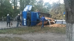 Судя по фото, большегруз с прицепом, груженным кирпичом, завалился на бок. При этом грузовик снес ограждение, а кирпичи рассыпались на газон. Полиции на месте ДТП пока нет. Что стало причиной аварии, предстоит выяснить дорожным полицейским.