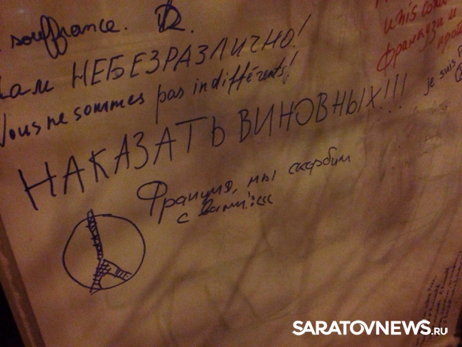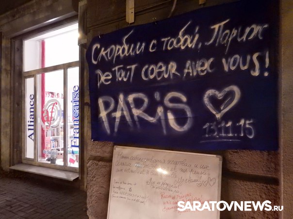 "L'Alliance Française de Saratov tient à exprimer ses sincères condoléances aux familles des victimes de l'attentat du 13 novembre à Paris. Un deuil national de trois jours a été décrété en France. Nous vous remercions pour tous vos messages de soutien auprès de la communauté français ("Альянс Франсез Саратов" выражает свои искренние соболезнования семьям жертв террористического акта в Париже 13 ноября.Во Франции объявлен трехдневный национальный траур. Мы благодарим также всех, кто прислал слова поддержки в адрес представителей Франци), - сказали в саратовском отделении языкового и культурного центра.