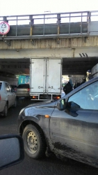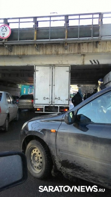 В Саратове под мостом на 13-м Белоглинском проезде застрял грузовик. Фотография с места ЧП появилась в группе "Местоположение ДПС Саратов и Энгельс" в социальной сети "ВКонтакте". Судя по всему, грузовик не рассчитал высоту, и надеялся проскочить под железнодорожным мостом, на котором установлен ограничительный по высоте знак 2,5 метра.