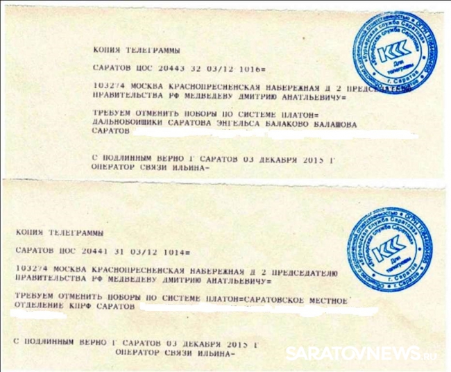 Саратовские дальнобойщики отправили телеграмму премьер-министру России Дмитрию Медведеву. Перевозчики требуют отменить плату за проезд по федеральным трассам по системе "Платон". Скриншот послания появился на официальном сайте саратовского отделения партии КПРФ.