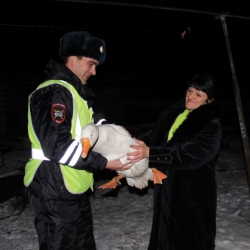 Мужчина с гусем попался на глаза сотрудникам патрулирующего городские улицы наряда ДПС. Откуда у него птица, мужчина объяснить не смог, и был задержан. Вскоре в отдел полиции пришла местная жительница, владелица пернатого. Она сообщила, что пятимесячный гусь исчез со двора. Теперь он возвращен хозяйке, решается вопрос о возбуждении уголовного дела о краже.