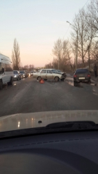 Сегодня около 8:00 на кольце Елшанки, недалеко от светофора произошла авария с участием двух легковушек: "пятерки" и иномарки. От удара "пятерку" развернуло на скользкой дороге поперек, в результате обе машины заблокировали две полосы проезжей части.