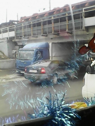 Водитель среднетоннажного грузовика (скорее всего - марки Исузу) решил проехать под мостом, понадеявшись, что высота его фургона меньше 2,5 метров. У него почти получилось, но задняя часть фургона прочно застряла под пролетом моста. В итоге грузовик перегородил одну полосу движения в сторону 2-ой Садовой.