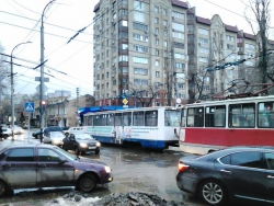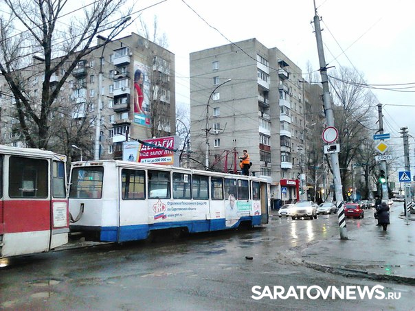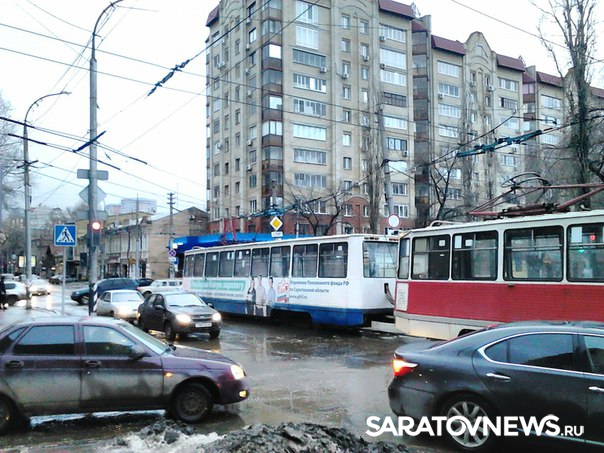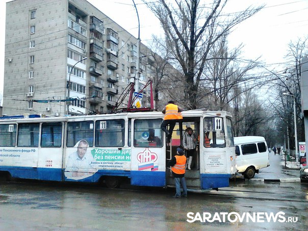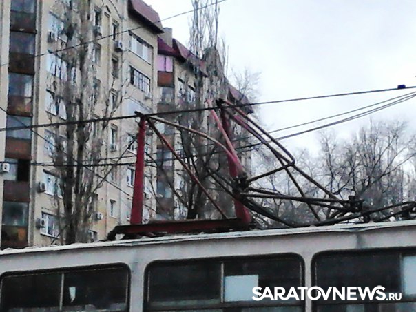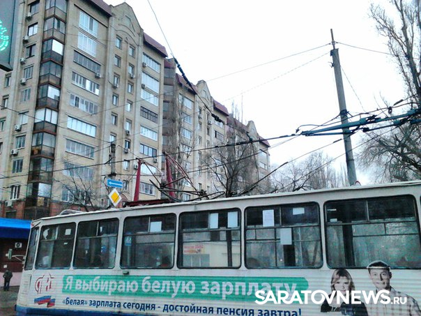 Сегодня с утра жители Саратова стали свидетелями крупной аварии в центре города. На пересечении Рахова и Советской головной вагон трамвая №11 сломал пантограф на "трамплине". В результате контактная сеть лишилась тока на всем перекрестке - это коснулось не только проводов, от которых запитаны трамваи, но и троллебусных сетей.