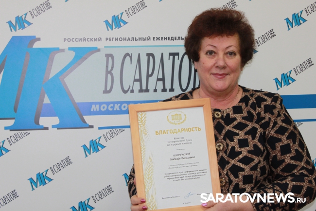 Благодарственную грамоту специальному корреспонденту газеты "Московский комсомолец" в Саратове" вручили за существенный вклад в информационное освещение работы агромышленного комплекса, многолетний добросовестный труд, высокий профессионализм и в честь Дня Российской печати. Как пояснила Надежда Барсукова, поздравление от главы аграрного комитета Госдумы стало для нее приятной неожиданностью.