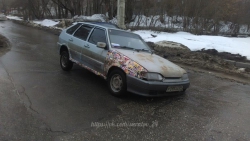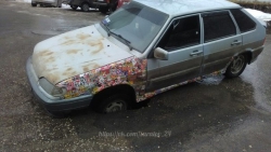 Автомобиль - старый ВАЗ-2114 передним левым колесом ушел в яму и не смог самостоятельно выбраться. По предварительным днным, он не попал в уже существующую яму, а асфальт провалился под ним во время движения.