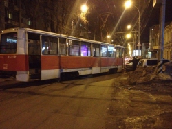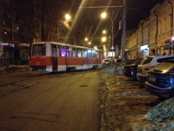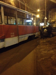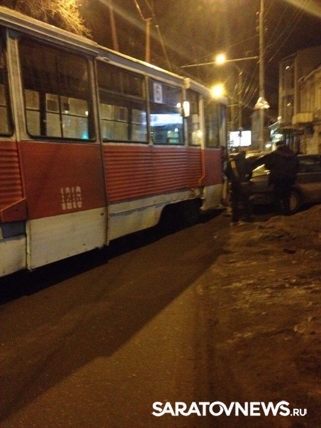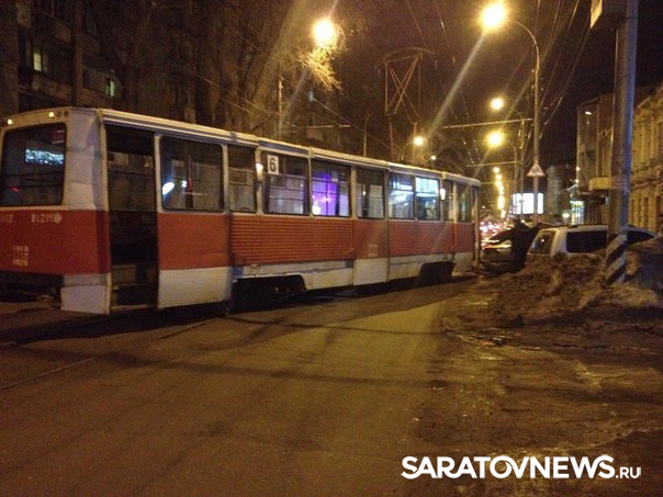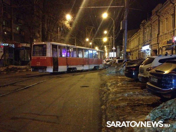 Вчера около десяти часов вечера в Саратове на улице Советская с рельсов сошел трамвай. Фотографии происшествия появились в группе ВКонтакте "Типичный Саратов".