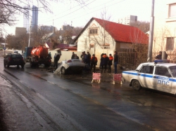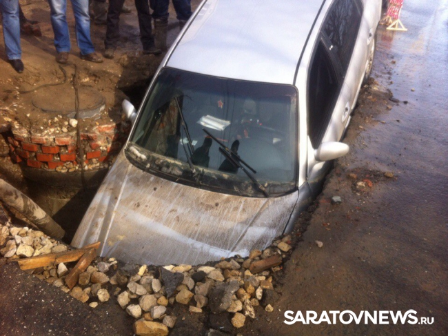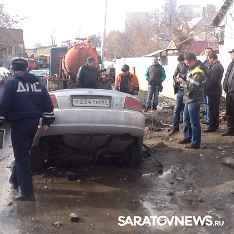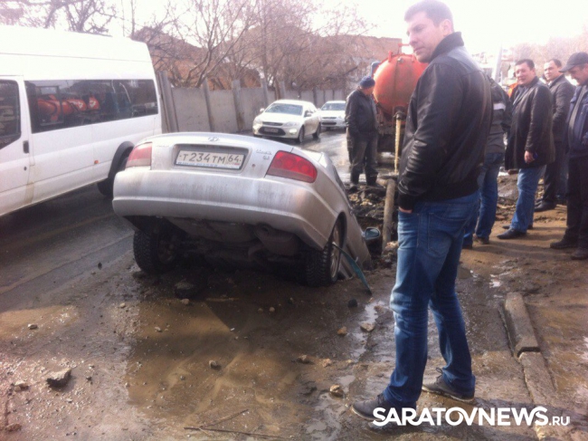 Яма, в которую попал автомобиль "Хундай Соната", была наполнена водой и не была ограждена. Об этом Saratovnews рассказал водитель попавшей "Хундай Сонаты" в дорожно-транспортное происшествие Антон. По его словам, он ехал по Большой Затонской и не сразу увидел яму.