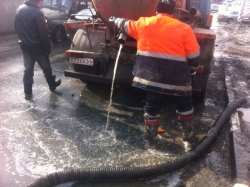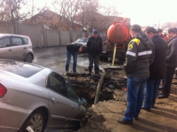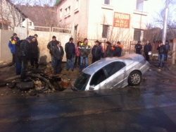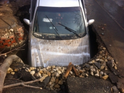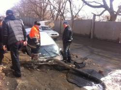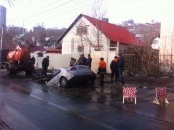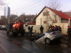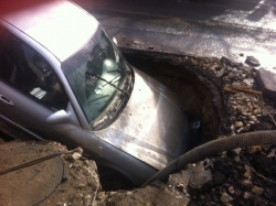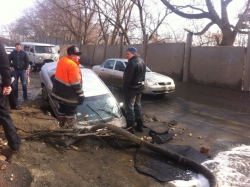 Коммунальщики, активно откачивающие воду с ямы, уже после того, как в нее угодила машина, чья яма – не признаются. "Кто ж вам скажет. Никто не признается, чья она", - сказал один из рабочих, отметив, что ограждения возле ямы все же были и они "сейчас лежат под машиной".