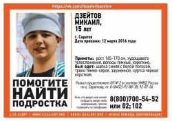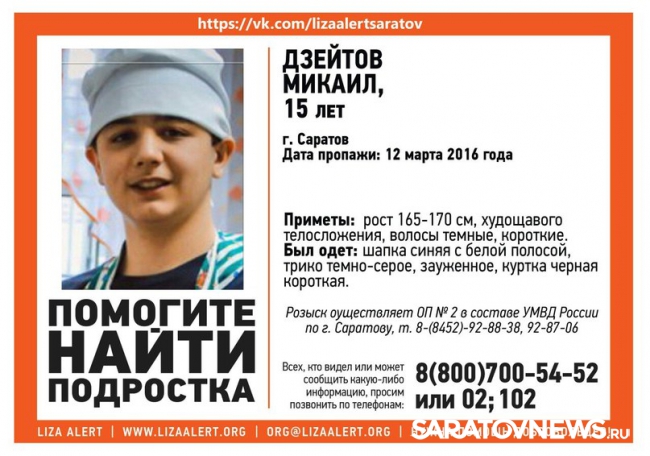 В Саратове разыскивается Дзейтов Микаил Микаилович, 2000-го года рождения. Ребенок пропал 12 марта 2016 года. Розыск ведет городское отделение полиции №2. К поискам мальчика подключилась поисковая группа "Лиза Алерт".