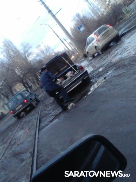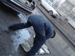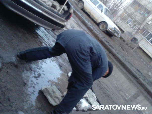 В Саратове к заделыванию ям на дорогах подключились местные жители. В группе "Саратов онлайн" в социальной сети "ВКонтакте" появились фотографии, на которых мужчина закладывает яму на улице фрагментами строения.