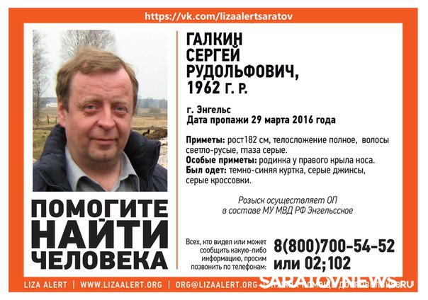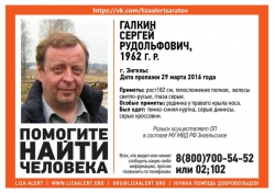 В Энгельсе Саратовской области разыскивают 53-летнего Сергея Рудольфовича Галкина. Как сообщается в соцсетях, мужчина пропал 29 марта 2016 года.