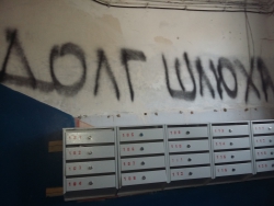 Жильцы сфотографировали изуродованный подъезд, и прислали в редакцию нашего издания фотографии. Согласно снимкам, коллекторы исписали стены оскорблениями, а на дверях жильцов, которые не имеют никакого отношения к должнику, нарисовали мужские половые органы.