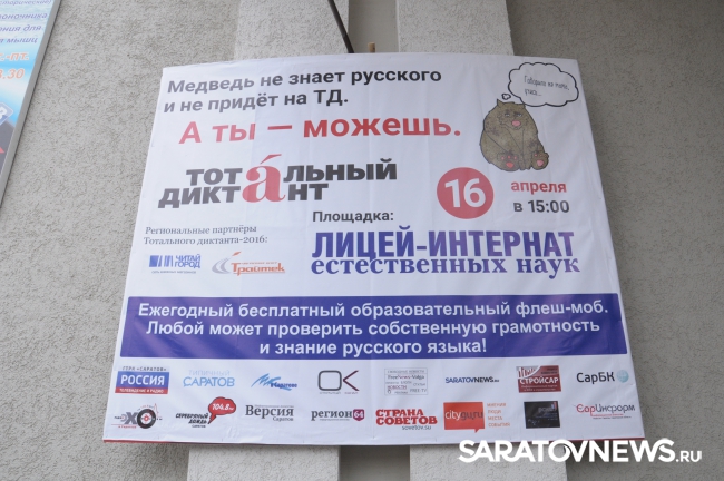 "Диктаторами" по традиции стали узнаваемые лица - так, на площадке ГТРК диктовала телеведущая Светлана Бородич, в СГУ - преподаватель и переводчик Вадим Михайлин, музыкант Василий Уриевский. В ЛИЕНе собралась целая плеяда "диктаторов": в самой большой аудитории работала сенатор и педагог по образованию Людмила Бокова, соседние занимали политик Александр Ермишин, издатель Алексей Колобродов, телеведущая Алла Шокина, журналист Ольга Радина. "Я с большим интересом наблюдала за тем, как проект "Тотальный Диктант" год за годом привлекал все больше городов-участников не только в России, но и по всему миру. В Саратове растет популярность проекта, а вместе с ней и число площадок для Тотального Диктанта. Люди тянутся к русскому языку и русской культуре. Это вызывает гордость и желание быть сопричастным", - комментировала факт своего участия член СовФеда от Саратовской области.