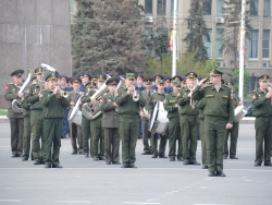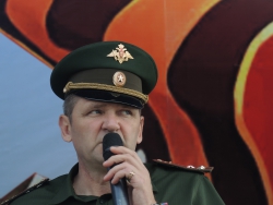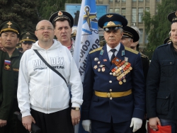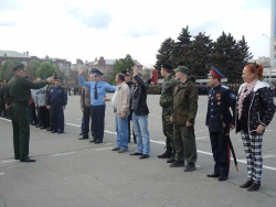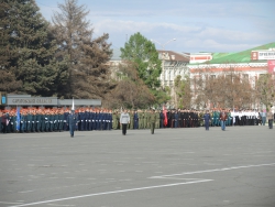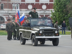 Командовал парадом подполковник Евгений Чалый, принимал парад полковник Валерий Мишнев. Полковник Мишнев расставил коробки участников шествия, уточнил расположение главной знаменной группы и действия оркестра. Затем командующие поприветствовали участников парада, среди которых были кадеты, казаки, моряки, спасатели, сотрудники полиции и таможни, участники боевых действий, летчики и другие. Всего сегодня вечером на Театральной площади выстроились порядка 2 тысяч человек - парадные расчеты воинских подразделений, ветеранских организаций, вузов и школ.
