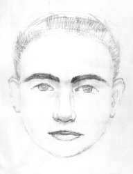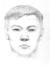По подозрению в этом деянии разыскивается молодой мужчина славянской внешности, его возраст примерно 25-28 лет, рост около 170 см. Худощавый, темноволосый, волосы средней длины и зачесаны набок, крупная голова, средний по ширине лоб. У подозреваемого острые черты лица, светло-карие глаза, темные угловатые брови, широкий рот, бледные, слабо окрашенные губы. Верхняя губа чуть нависает над нижней, шея тонкая, пальцы на руках худые и длинные.