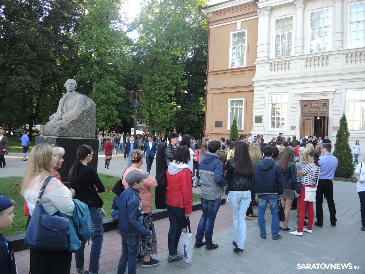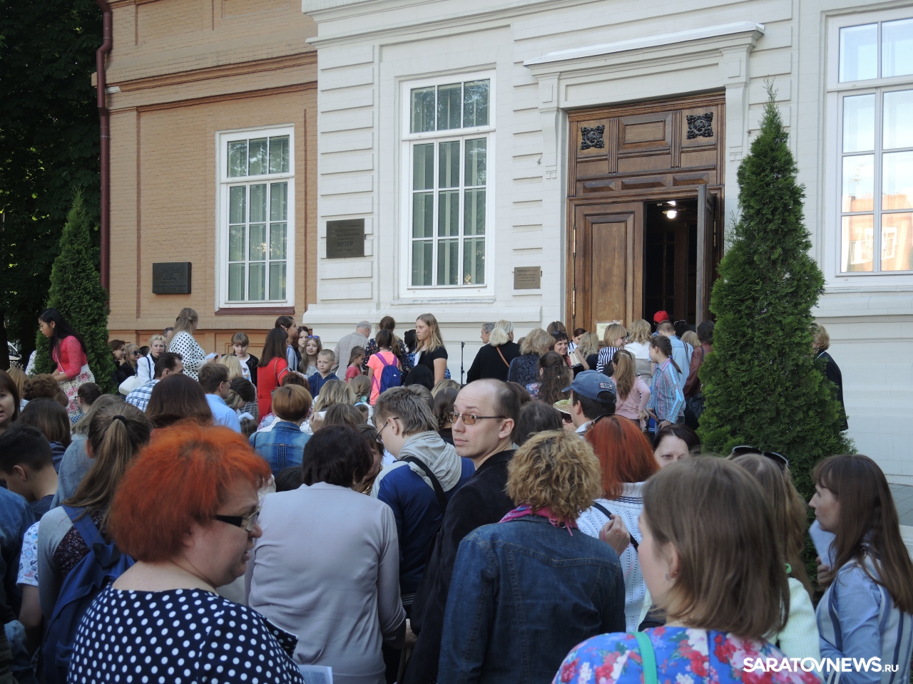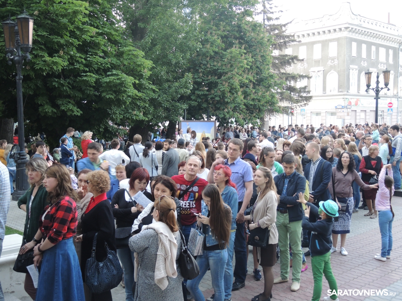 На площади около исторического здания музея имени Радищева в 17:45 находилось порядка 60 человек, еще несколько сотен бродили по ярмарке мастеров. Однако, люди постоянно прибывали и образовали стройную очередь, выходящую за пределы площади и сворачивающую на Радищева, всего за 10 минут.