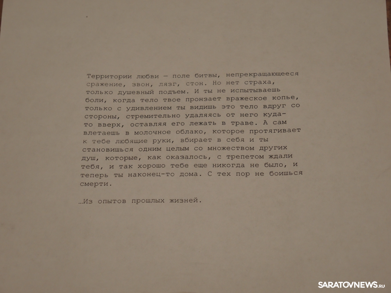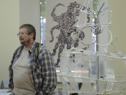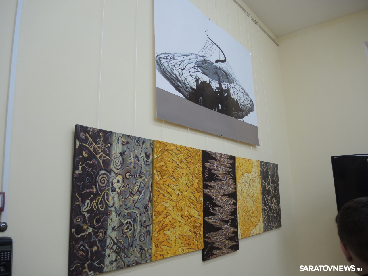"Если ослабить связи между частицами, из которых мы состоим, мы сможем проходить друг через друга. Персонажи моих картин - волны, кванты, элементарные частицы. Но они живые, они могу чувствовать", - уверен Карнаухов. "Сейчас довольно рутинное время, и пора смотреть в будущее. Поэтому фантастика сейчас очень актуальна, надо встряхнуть людей, пусть они тянутся к звездам", - сказал художник и добавил, что вчера провел уже третью акцию межгалактического искусства. Кроме того, по его словам, Саратов особо близок к фантастике, так как "в этом городе может быть все, что угодно". В качестве примера он напомнил, что по одной из легенд, город Укек могли уничтожить таинственные "подземные змеи".