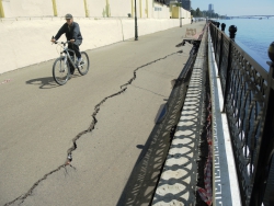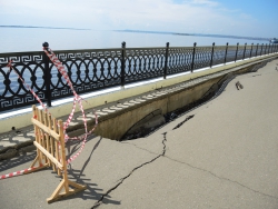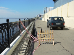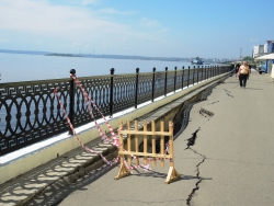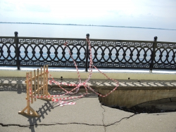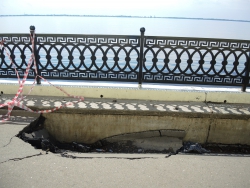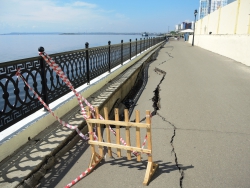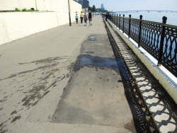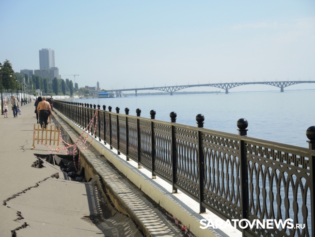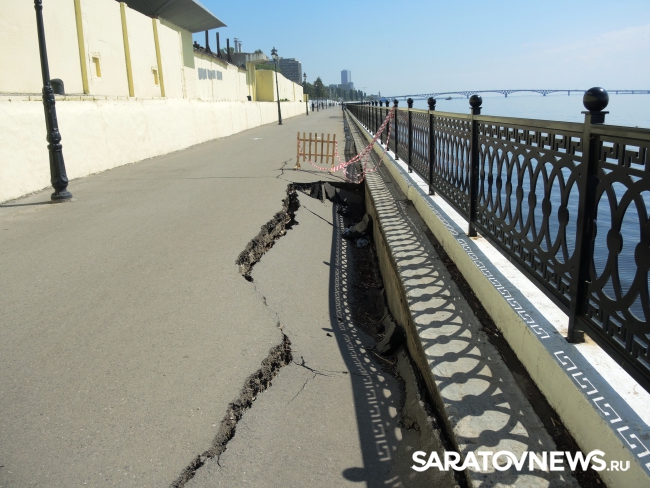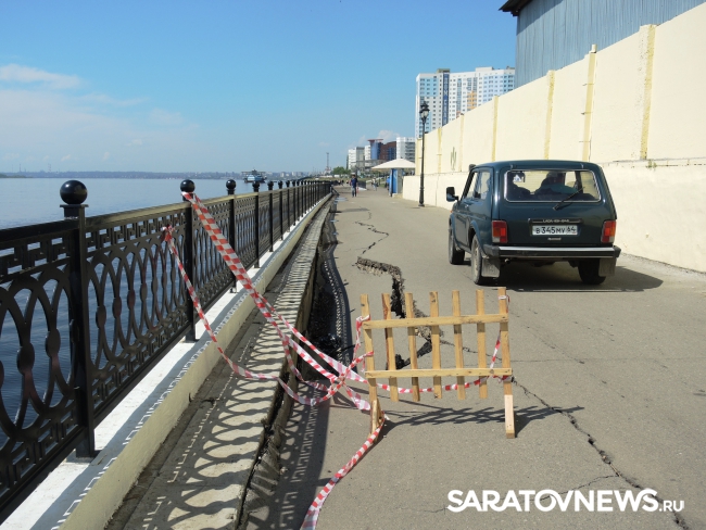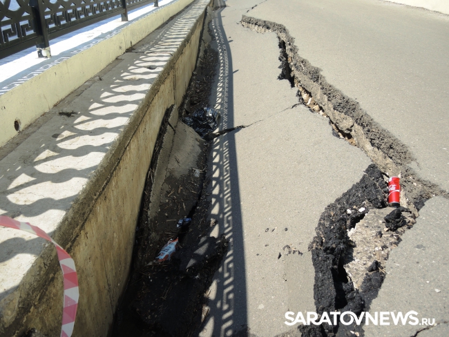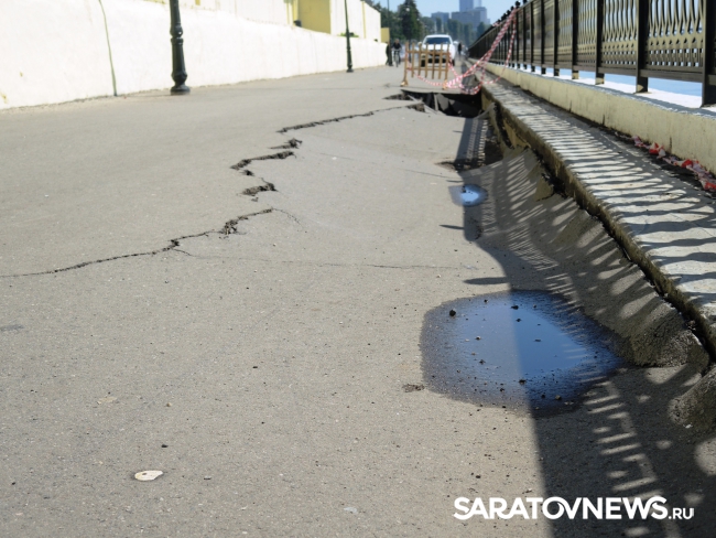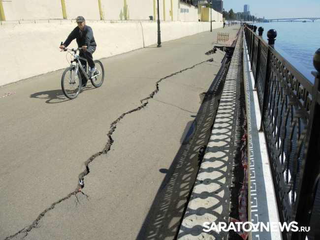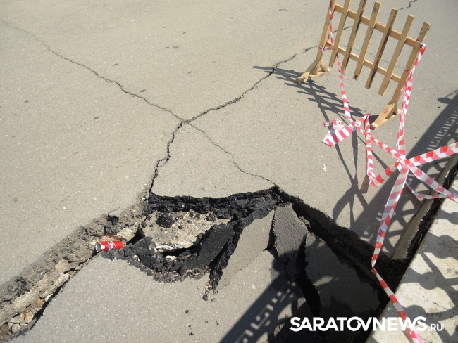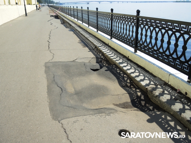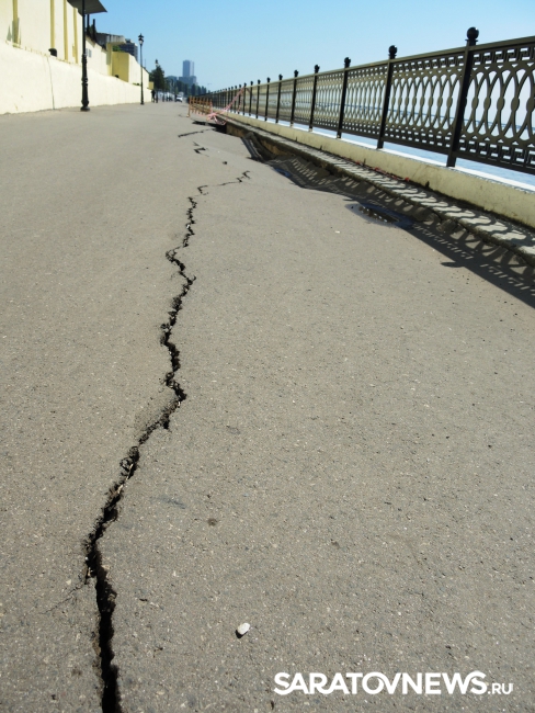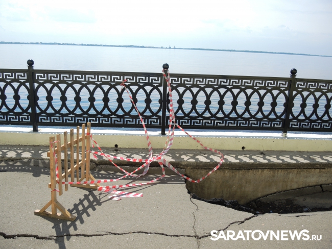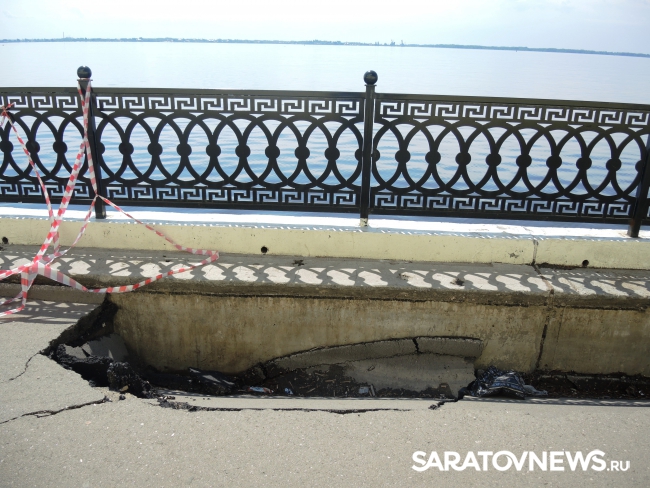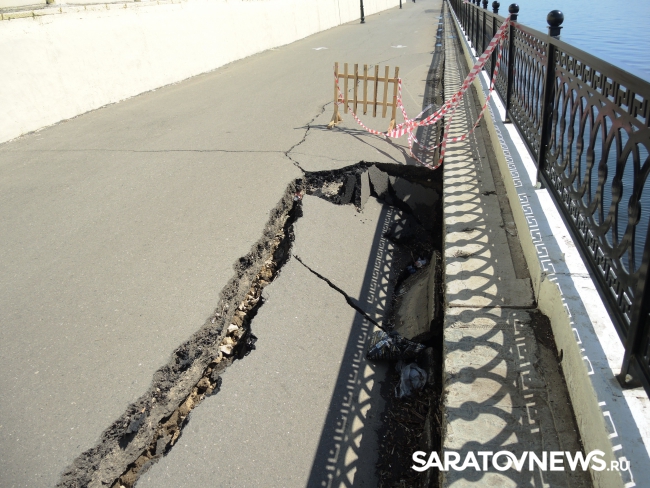 На новой набережной Саратова произошло очередное обрушение. На этот раз провалился кусок асфальта напротив комбикормового завода. Глубина рытвины около метра, длина – порядка четырех, огражден опасный участок только с одной стороны. Горожане с опаской проходят мимо обрушения, и уже успели закидать ее мусором.