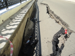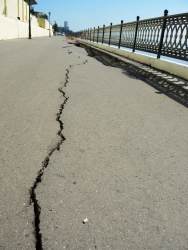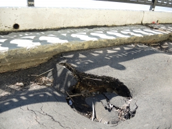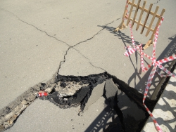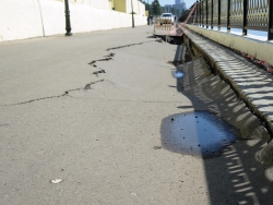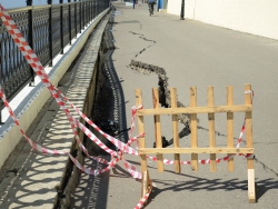 От ямы в разные стороны расходятся трещины. В настоящее время пешеходная зона просела на протяжении около двадцати метров. По обеим сторонам провала две другие ямы, которые, судя по всему недавно залатали. На одной из них, несмотря на починку вновь образовалась яма, асфальт на обоих участках пошел волнами.