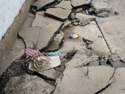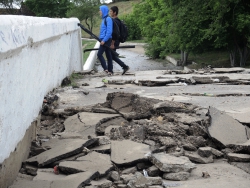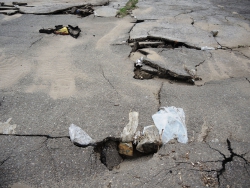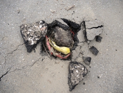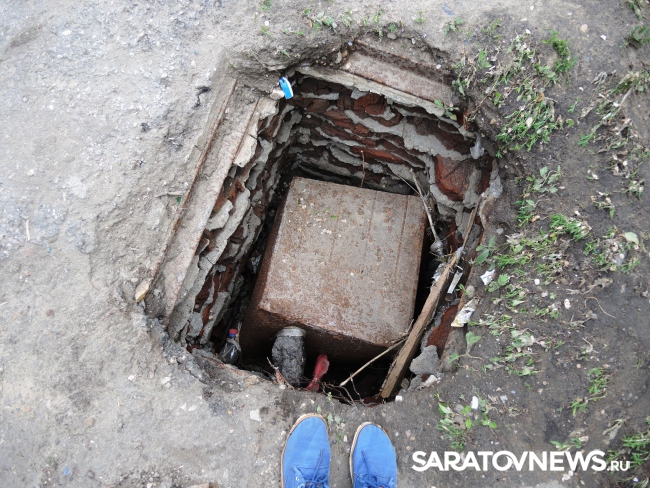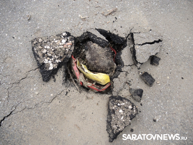 Кроме груд разбросанных кусков асфальта, на площадке зияет неогражденная дыра. При этом асфальт продолжает проседать прямо под ногами, а под оголенными плитами слышится звук воды.