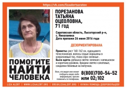 В Саратовской области разыскивают 71-летнюю Татьяну Оцеоловну Порезанову. Как сообщается в социальных сетях, женщина пропала в воскресенье, 26 июня 2016 года, в районе села Урицкое (рядом с селом Николаевка) в Лысогорском районе области. Пропавшая страдает потерей памяти. В Саратове она жила в доме 2 на улице Комсомольская. Всем, кому известно о местонахождении женщины, можно обращаться по телефонам 8 (929) 776-33-15; 8 (965) 888-38-39.