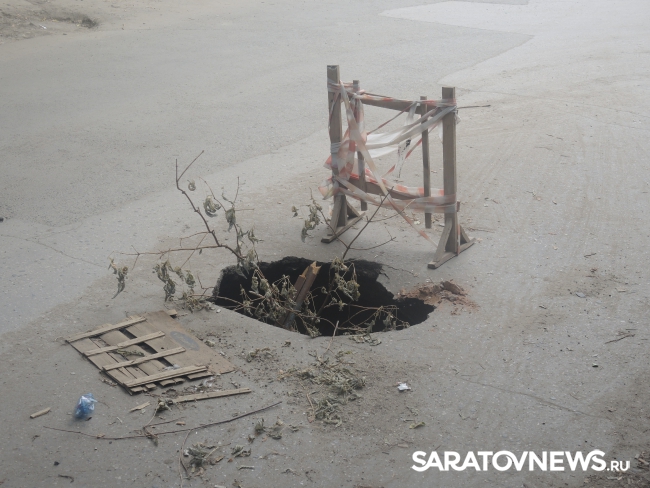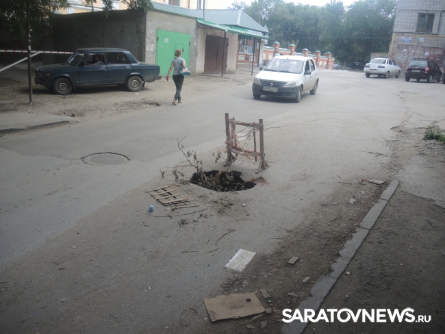 Тем временем, как убедился корреспондент Saratovnews, провал все еще находится на прежнем месте. Ремонтные работы здесь не проводятся, яму огородили только с одной стороны.