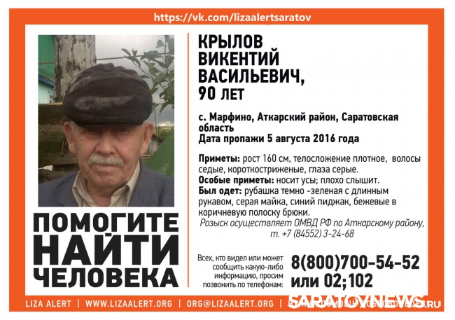Последний раз 90-летнего жителя села Марфино Аткарского района видели 5 августа 2016 года.