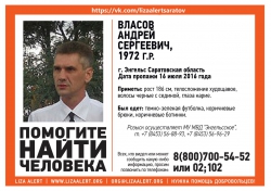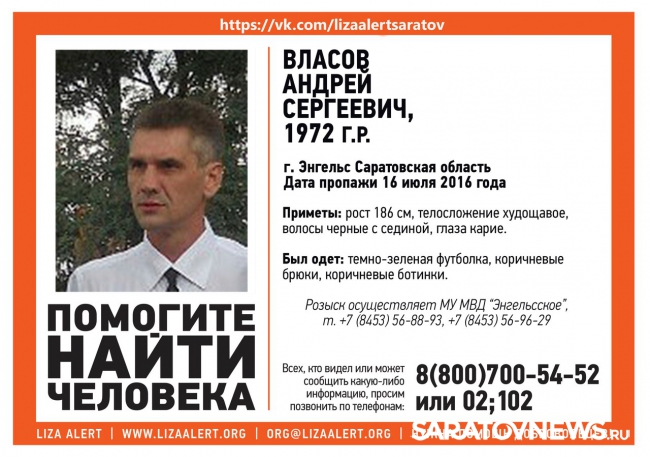 В Энгельсе пропал 44-летний Андрей Власов. В сообществе "Поисковый отряд Лиза Алерт Саратов" в социальных сетях рассказали, что мужчину последний раз видели 16 июля 2016 года.
