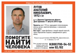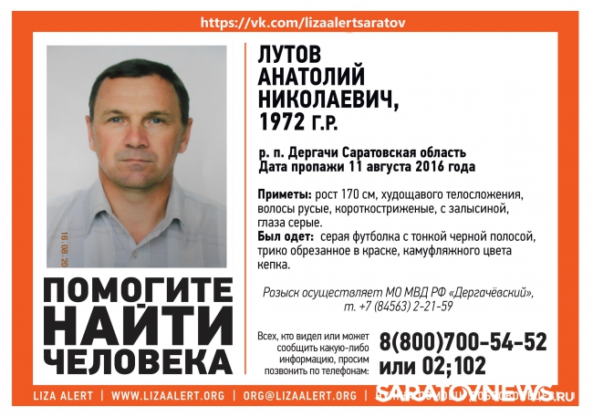 Поисковики также розыскивают пропавшего жителя Дергачей. 44-летний Анатолий Лутов исчез 11 августа 2016 года. Его описывают как худощавого мужчину 170 сантиметров ростом, волосы короткостриженные русые и с залысиной, глаза серые. В последний раз его видели одетым в серую футболку с тонкой черной полосой, в испачканном в краске обрезанном трико и камуфляжного цвета кепке.