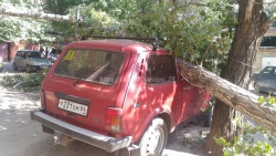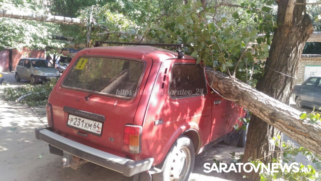 Дерево рухнуло на "Ниву", припаркованную рядом с ним. Об этом сообщили очевидцы в группе "Саратов онлайн" социальной сети "Вконтакте". На фотографиях, опубликованных в группе, заметно, что дерево смяло всю переднюю половину машины, повредив крышу и стекла на водительском и переднем пассажирском сиденье.