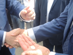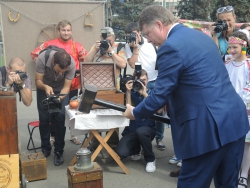 Затем глава департамента из Москвы отчеканил памятную монету на импровизированном монетном дворе. Монетку он отдал Валерию Радаеву.
