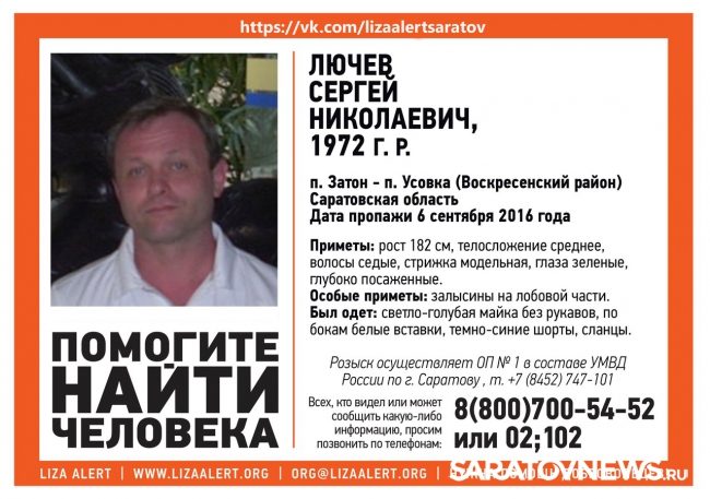 Как сообщили активисты на странице группы "Лиза Алерт Саратов" в социальной сети "Вконтакте", мужчина пропал в районе поселка Затон и поселка Усовка в Воскресенском районе губернии. Родные потеряли с ним связь 6 сентября 2016 года.