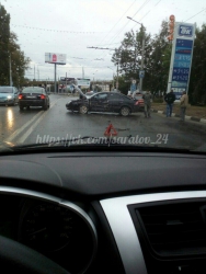 Напротив АЗС столкнулись "Ситроен" и легковушка, в результате ДТП иномарка встала поперек дороги и блокировала движение по обеим полосам движения.
