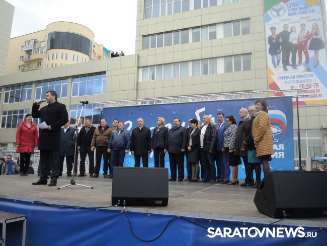 У саратовской консерватории прошел митинг в честь победы на выборах партии "Единой России". В торжественном мероприятии, которое называлось "Спасибо за поддержку" приняли участие губернатор Саратовской области Валерий Радаев, депутаты Ольга Баталина, Николай Панков, Олег Грищенко и другие.