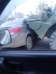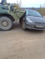 Судя по фотографиям, которые успели сделать очевидцы, БТР протаранил правую часть автомобиля "Хундай Солярис".