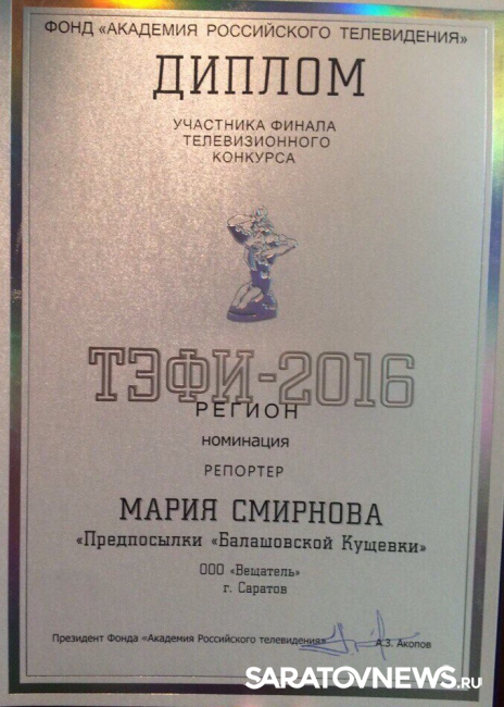 Репортаж Марии Смирновой "Предпосылки "Балашовской Кущевки" признан одним из лучших на главном телевизионном конкурсе страны. Члены жюри "ТЭФИ - Регион 2016" отобрали работу для участия в финале конкурса.