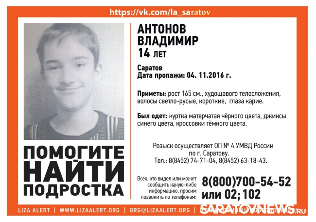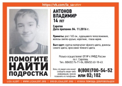 В Саратове вчера пропал 14-летний Владимир Антонов. Его приметы: рост 165 см, худощавого телосложения, волосы светло-русые, короткие, глаза карие. Был одет в матерчатую куртку черного цвета, джинсы синего цвета, кроссовки темного цвета.