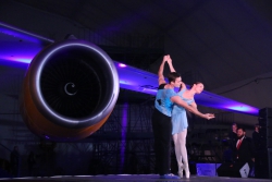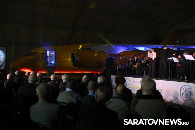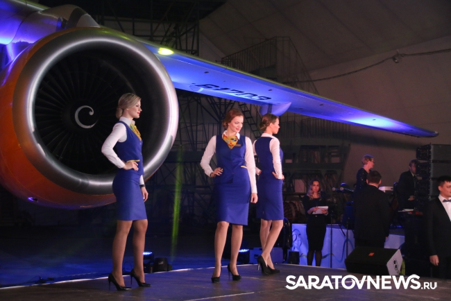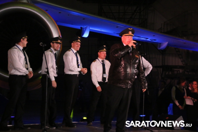Сотрудники авиакомпании услышали торжественные слова и поздравления почетных гостей. На сцене прозвучала музыка в исполнении оркестра "Волга-бэнд". Сотрудники "Саратовских авиалиний" также вышли на сцену и исполнили известные песни.