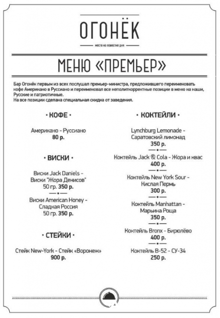 "Огонёк" первым из всех послушал премьер-министра, предложившего переименовать кофе, и переименовал все неполиткорректные позиции в меню на наши, русские и патриотичные", - прокомментировали новое меню владельцы бара в социальных сетях.