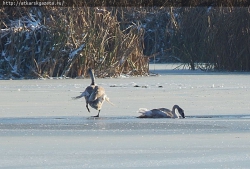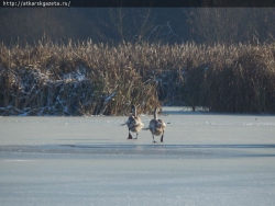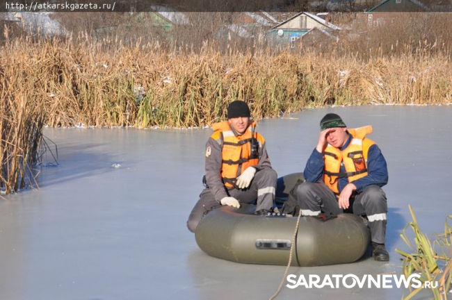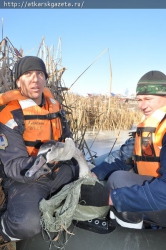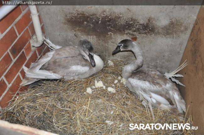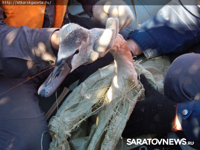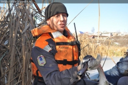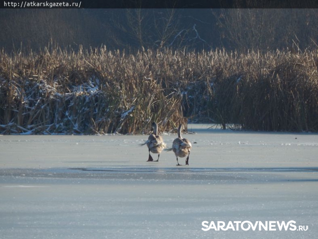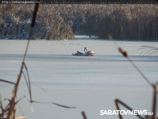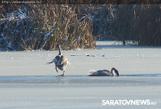 В Аткарске Саратовской области сотрудники Областной службы спасения пришли на помощь двум замерзающим на озере лебедям.