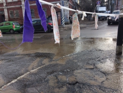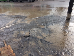 Она разливается по тротуару и проезжей части. Чтобы избежать необходимости ходить по толще воды, на асфальт бросили доски, опасные участки огородили флажками. Огромный ручей достигает улицы Московская.