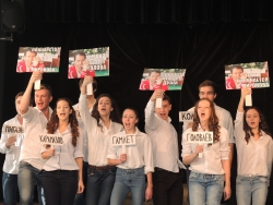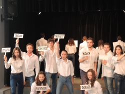 В честь юбилея Миронова студенты САТИ выступили с театральной постановкой. Они показали представление, где рассказали о этапах жизни артиста - его детстве, когда он был замечательным ребеном, и "все хотели его чмокнуть", об учебе, работе в Театре Наций и кинематографе. Миронов с улыбкой смотрел постановку.