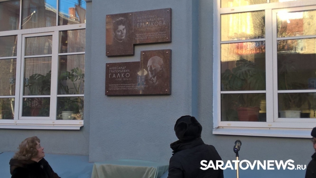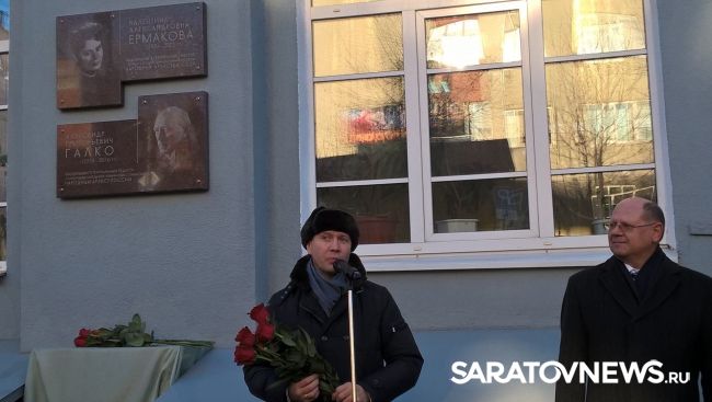 Сегодня на здании Саратовского театрального института на Рабочей, 23 открыли мемориальные доски Народным артистам России, педагогам Валентине Ермаковой и Александру Галко. На открытии присутствовал ученик мастерской Ермаковой, Народный артист России Евгений Миронов,который недавно отметил 50-летний юбилей, зампред правительства Саратовской области Иван Кузьмин, студенты и преподаватели театрального института.