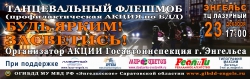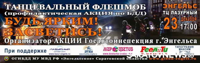 В Энгельсе в ТЦ "Лазурный" 23 декабря в 17.00 состоится танцевальный флешмоб "Будь ярким! Засветись!". Организатором мероприятия является Госавтоинспекция города Энгельса.