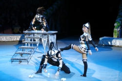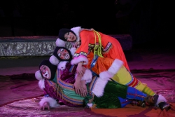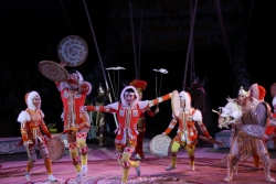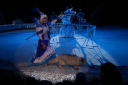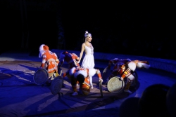Под звуки варгана и барабана выступили актеры с акробатическими трюками, полетами под куполом цирка и неожиданнами спецэффектами. Зрители увидели дрессированных голубей, песцов, лисиц и оленей. Во второй части представления в клетке встретились львы, пантеры, пума и леопарды.