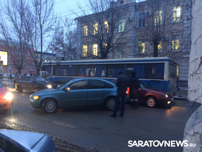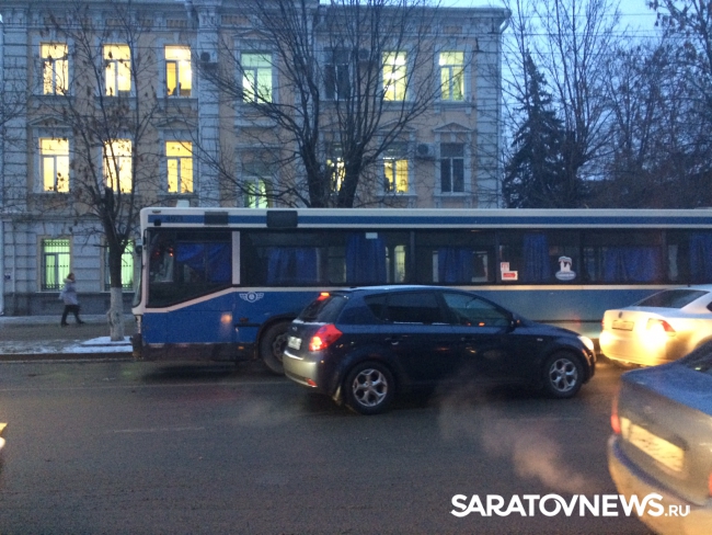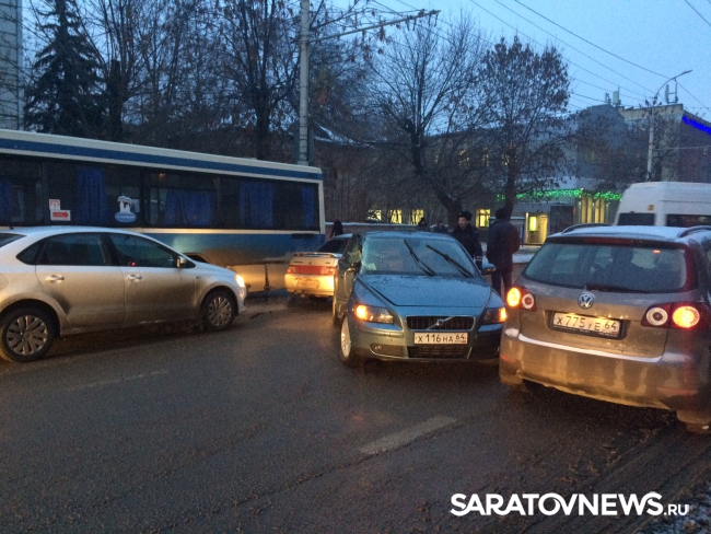 В эти минуты в Саратове на улице Московской из-за аварии с автобусом заблокировано движение машин и общественного транспорта.