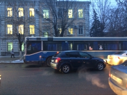 Дорожно-транспортное происшествие случилось неподалеку от пересечения с улицей Пугачевской на выделенной полосе для общественного транспорта. Столкнулись автобус 90 маршрута и иномарка. От удара легковушку развернуло прямо не проезжей части. Удар пришелся на правый бок иномарки.